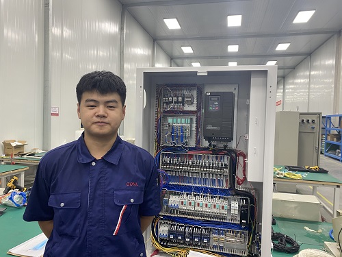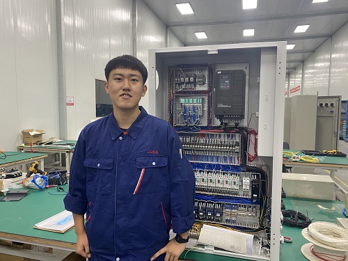 唐老師在光洋人事王女士陪同下,來到了裝配車間,看到了正在這里工作的學生,在這個工作區域有17級機電一體化專業的畢業生馮堯和關翯遠,還有19級機電一體化專業實習生崔寶科,學生們對于唐老師的到來,也表現的非常高興,通過與學生的聊天,唐老師得知,馮堯和關翯遠兩名同學在2020年就已經轉正,成為了企業正式員工。馮堯同學表示,在企業工作這兩年,收獲了很多,也成長了很多,從剛進入企業實習的“菜鳥”,到現在已經能獨立完成配電柜的組裝,確實有很多艱辛要付出,但是現在看看,所有的付出也都是值得的。關翯遠同學說,在這里,老的員工對于新人都很照顧,和大家都相處的很好,早已經把自己徹底的融入到了企業中去,也讓老師和學校放心,我們在這里一定會好好工作,照顧好新來的學弟。